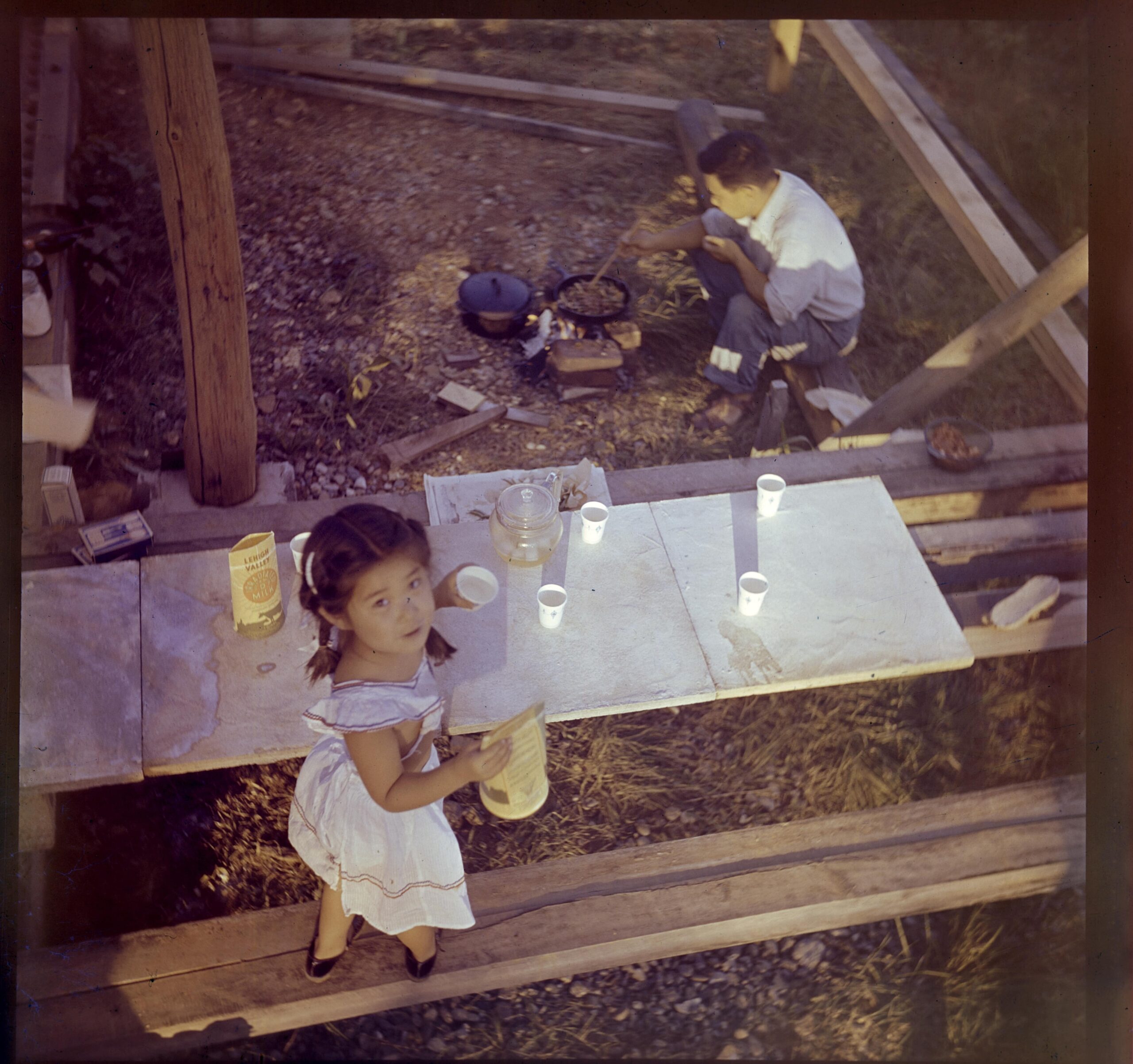 Young Mira enjoying a meal on the concrete roofing tiles with George in the frame of the Family House.