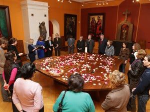 Among the guests in Moscow at the Sacred Peace Table in the Hall of Peace in the Russian Academy of Arts were: Director of Jawaharlal Nehru Cultural Center in Moscow, Mr. Bandaru Wilsonbabu; Chief Scientific Secretary of the Presidium of the Russian Academy of Arts (RAA), Oleg Koshkin; Vice-President of the Russian Academy of Arts, Andrey Zolotov; First Deputy President of the RAA Sergey Kolov; members of the Russian Academy of Arts and Friends of the Nakashima Peace Table project including†Quakers from the Society of Friends.
