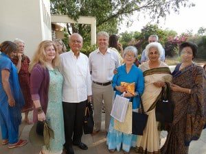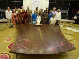 Left to right: Miriam Belov, Nakashima Foundation for Peace board member, Ambassador Chinmaya Gharekhan –president of the Indira Gandhi National Centre for the Arts, Carel Thieme – an Aurovilian who initiated the project of the Sacred Peace Table in 1996, Mira Nakashima-Yarnall, Aster Patel – an early ashramite & Aurovilian on the Auroville Foundation and Rita Gharekhan.