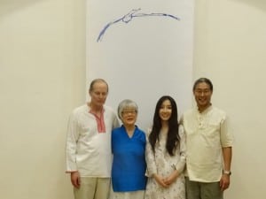 Left to right: Jon Yarnall, Mira Nakashima-Yarnall, Soomi and Ru Amagasu. Traveling together from the USA were Mira and her brother Kevin Nakashima with several family members including Mira’s husband Jon, her son Ru and his wife Soomi whose young son Toshi lit the candle to begin the event. Miriam Carpenter, artist and designer at the Nakashima Studios also attended. The banner behind the group shows The Mother’s signature, which is visually “the Bird of Peace descending upon earth”.