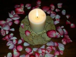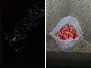 Right: The fragrance of rose petals scented the dark cool air awaiting the ceremony start. There would be such petals placed at each site this day – New York, Moscow and Auroville where the Hall of Peace would be dedicated.