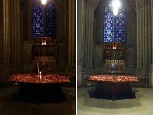 Left: On this day of Unity, February 11, 2014, it was a bitter cold and dark morning in Manhattan. I entered the Cathedral of St John the Divine in the black of night at 6am. The only light came from the pin point lights on the recently installed Phoenix sculptures created by the Chinese artist Xu Bing eerily floating above and suspended from the rafters of the Cathedral. Soon Rev Canon Julia Whitworth joined and we prepared for our welcome of unity.