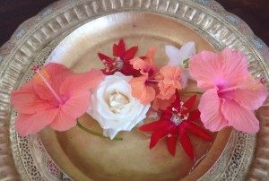 There were many flowers on the Nakashima Sacred Peace Table that helped to elevate the atmosphere: lotuses, roses, birds of paradise, orchids, lilies, jasmine, tuberose, French marigolds. Many were even given away to the participants in the end. In India and throughout all of Asia, flowers are often an integral part of a ceremony. It was especially fitting to do so at this event. In Auroville, the inspiring flute music of Gordon Korstange accompanied the ceremony.