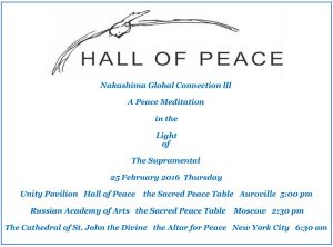 May the words below suffice as written by Miriam and recited by all contemporaneously in Auroville at the Sacred Peace Table in the Hall of Peace; in Moscow at the Sacred Peace Table in the Russian Academy of Arts; and in New York City at the Altar for Peace in the Cathedral of St. John the Divine.