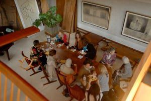 Once everyone gathered first in the Conoid Studio, it was laughter and excitement as they were busy taking pictures of the place and the beautiful furniture designed by George Nakashima and Mira. Mira gave a short history of George’s life. We then divided into two groups. Ru Amagasu, Mira’s son, took one while Mira toured the others. Mira’s husband, Jon Yarnall, helped and shared stories. Kevin Nakashima, Mira’s brother, also shared stories and regaled the women. All visited the Wood Shed which holds vast amount of wood planks from all over the world. Then, onto the cozy “Mountain Villa” with its precious tea room. Finally, all walked down to the Foundation for Peace Arts Building to reconvene and have lunch.
